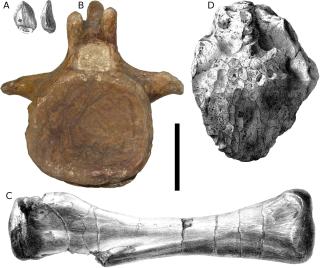 view; right ilium in lateral view and ?fourth dorsal vertebra in